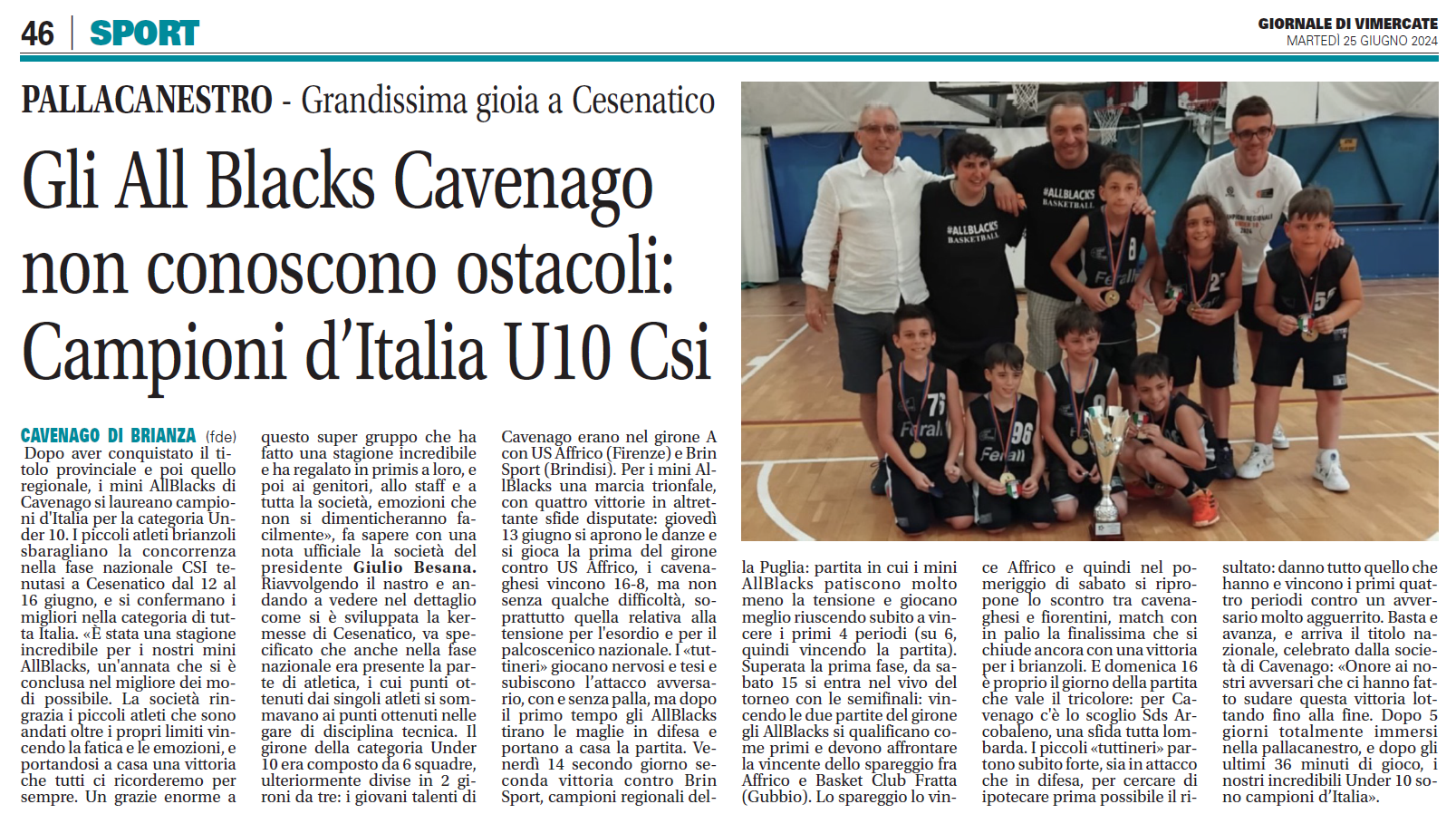 Il Basket Club Cavenago Brianza A.S.D. comunica che, in conformità con quanto disposto dal D.Lgs n. 39/2021 (art. 16), dalla Delibera CONI del 25 luglio 2023 (art. 3) e dai Principi dell’Osservatorio CONI dell’agosto 2023 (art. 4 e 8), è stato nominato il Responsabile di prevenzione abusi, violenze e discriminazioni nell’attività sportiva e ha adottato il “Modello di Organizzazione e Controllo Interno” e il “Codice di Condotta”.